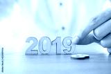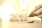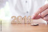 Hands of businessman change wood text 2018 to new year 2019.