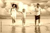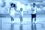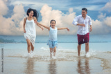 Happy asian family - father, mother, kid hold hands and run together with fun along daylight sea beach. Travel, active lifestyle, parents with children on tropical summer vacations.