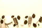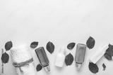 Composition with spa cosmetics and towel on light background