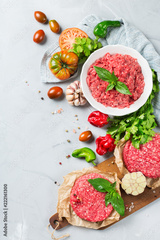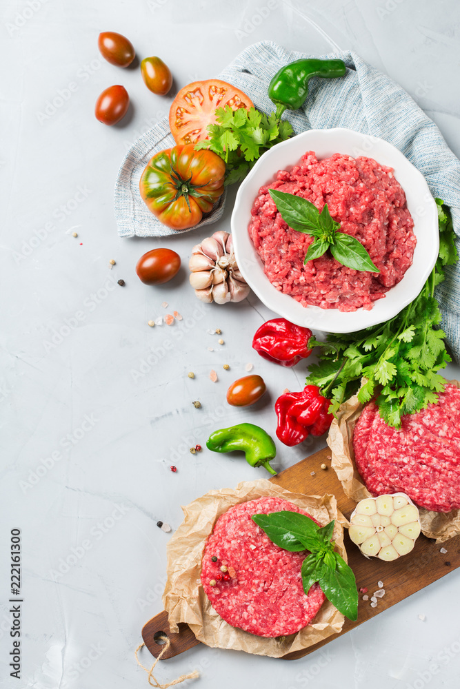 Homemade raw organic minced beef meat burger cutlet and vegetables