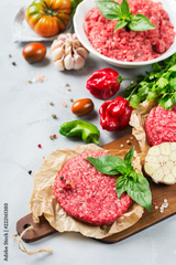 Homemade raw organic minced beef meat burger cutlet and vegetables