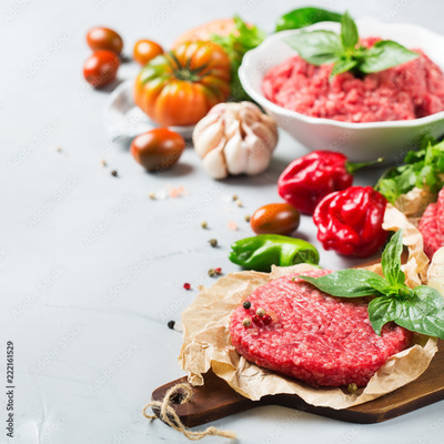 Homemade raw organic minced beef meat burger cutlet and vegetables