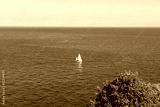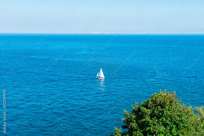 One Sailing yacht in еру ьшввду of brigh blue sea. Travel and active lifestyle concept. Selective focus. copy space.