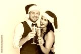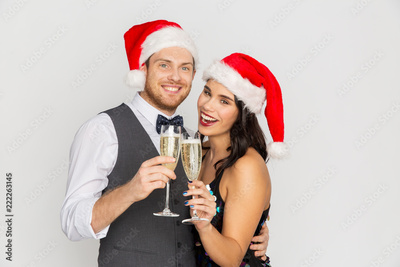 celebration, people and holidays concept - happy couple in santa hats with glasses of non alcoholic champagne at christmas or new year party