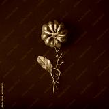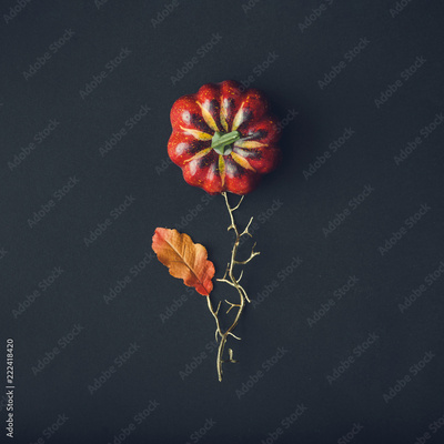 Flower concept made of pupmkin and autumn yellow leaf dark background. Season concept.
