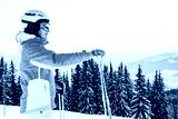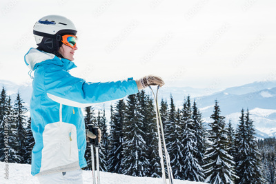 a woman in a blue suit, a helmet and glasses is standing with skis on top of a mountain