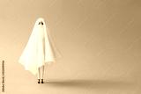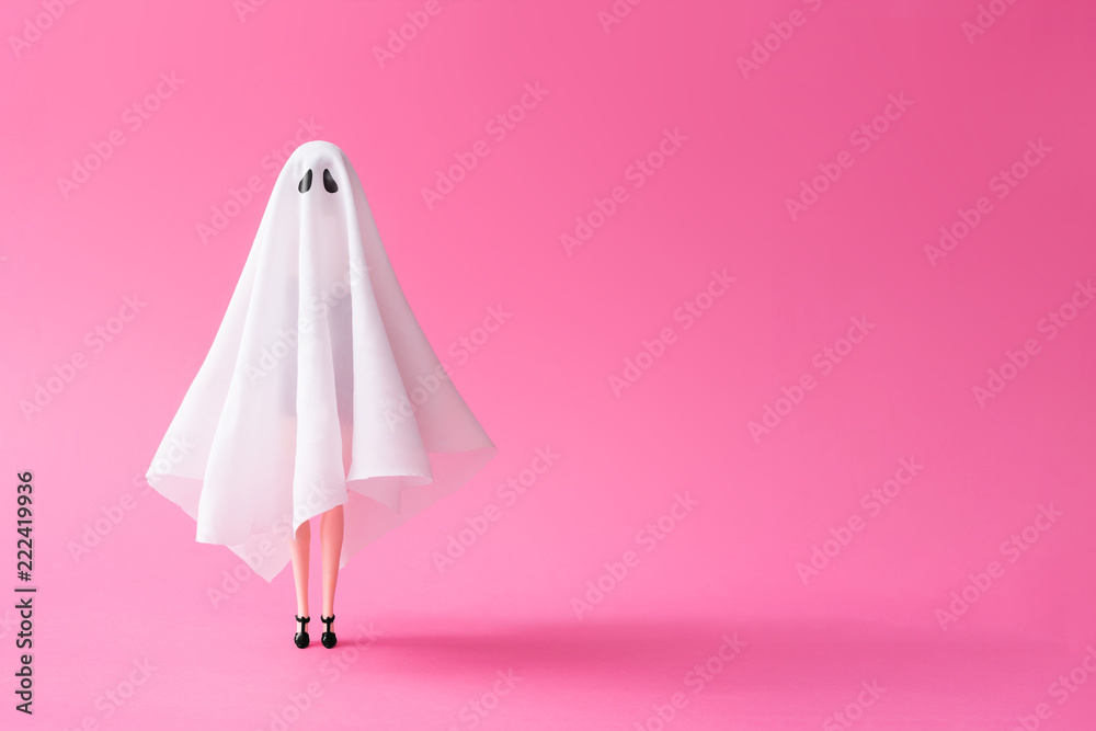 Girl in ghost costume against pastel pink background. Halloween party minimal concept.