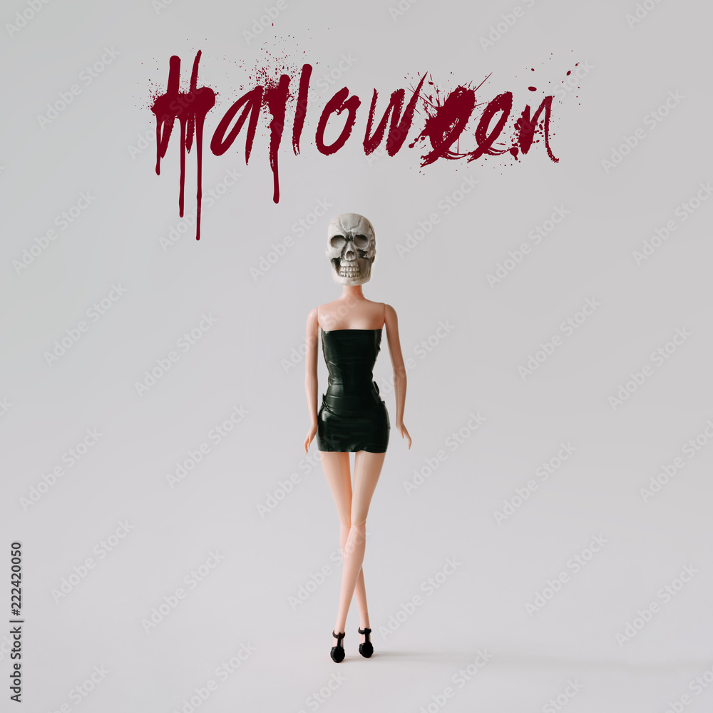 Girl doll with Halloween skull costume. Minimal holiday concept.