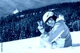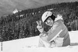 woman in blue suit, helmet and glasses sits on the snow near the skis on top of the mountain