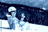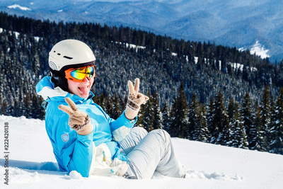 woman in blue suit, helmet and glasses sits on the snow near the skis on top of the mountain