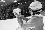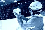 woman in a blue ski suit and mask on top of a mountain holding a snow in the shape of a heart