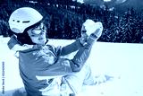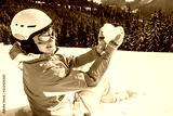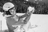woman in a blue ski suit and mask on top of a mountain holding a snow in the shape of a heart