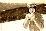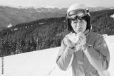 a woman in a blue ski suit is holding a handkerchief and wiping her nose. Skier with cold