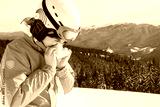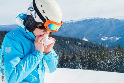 a woman in a blue ski suit is holding a handkerchief and wiping her nose. Skier with cold