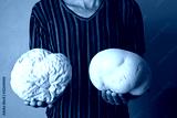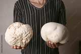 Man holding two mushrooms Giant puffball as brain. Big edible mushrooms Calvatia gigantea. Concept brain wrinkles.