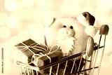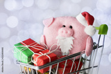 .The symbol of the year 2019 is a pig with gifts in a shopping trolley close-up.