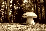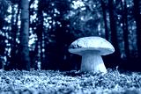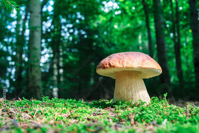Big white mushroom in summer forest. Nature landscape photography