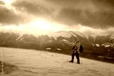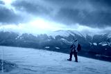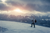 Alone photographer on mountain top in snowstorm with a backpack in winter time. Travel concept. Carpathian mountains. Landscape photography