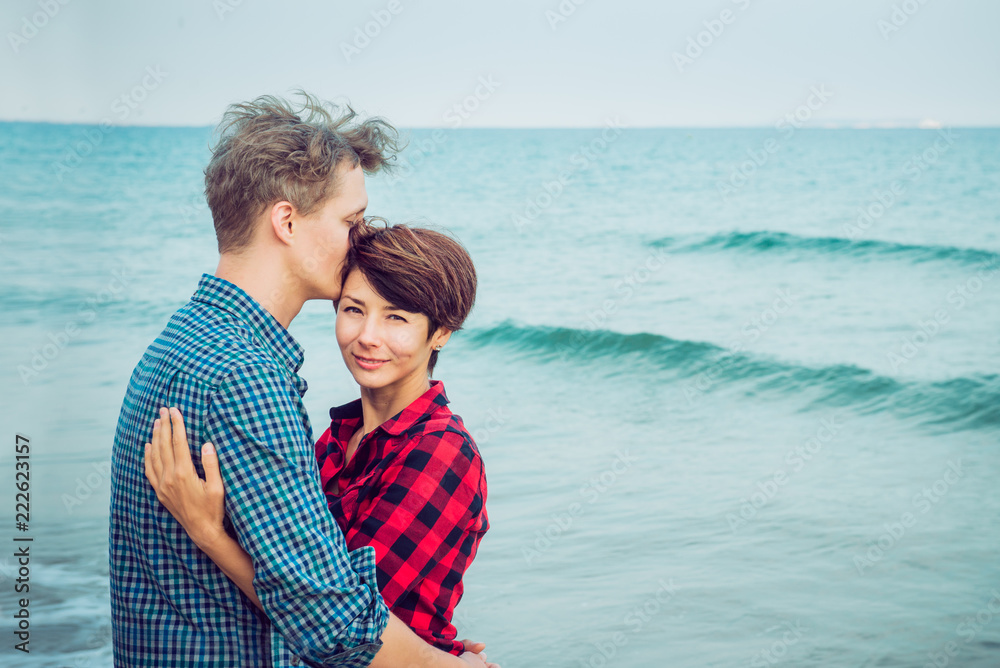 Portraits of happy romantic couple on the sea beach embracing each other. Concept of lovers happy moments on holiday, vacation. Boyfriend and girlfriend having date. Selective focus. Copy space.