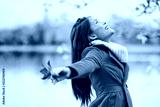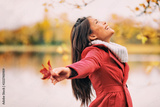 Autumn woman happy smiling feeling free in fall nature. Nature people beauty landscape. Girl by the lake.