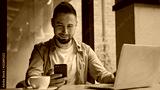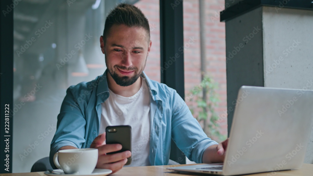 A young man sitting and using a computer and a phone indoors. Medium shot.