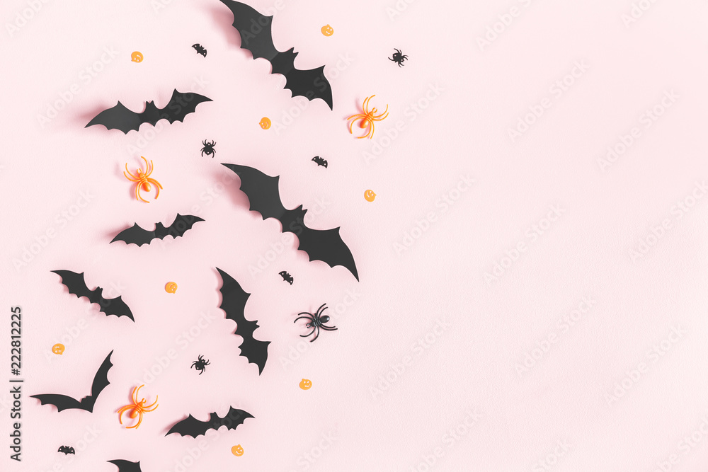 Halloween decorations on pastel pink background. Halloween concept. Flat lay, top view, copy space