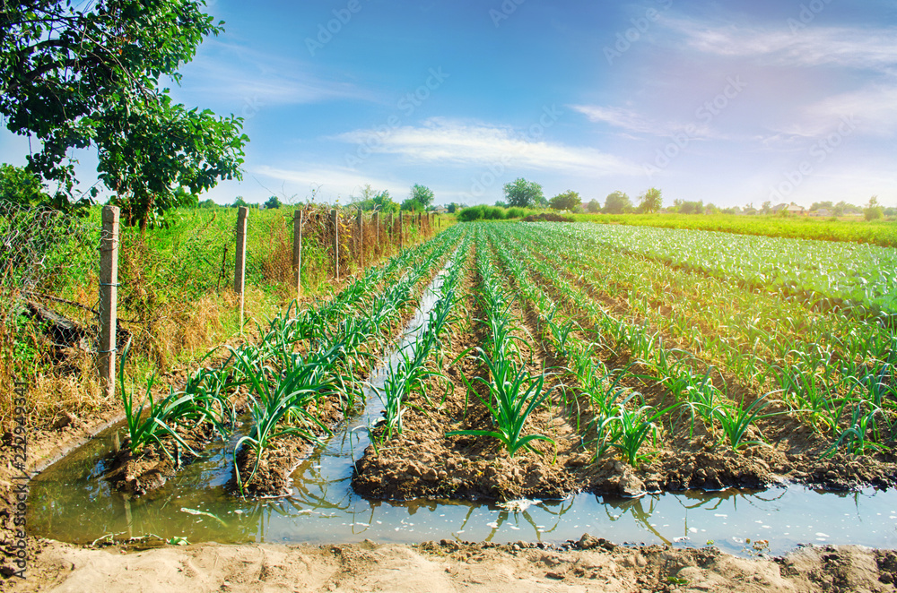 natural watering of agricultural crops, irrigation. leek plantations grow in the field. vegetable rows. farming agriculture