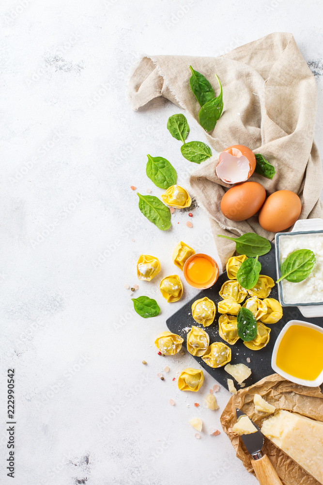 Italian food and ingredients, handmade tortellini with spinach and ricotta