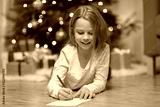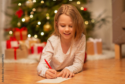 christmas, holidays and childhood concept - smiling girl writing wish list or letter to santa at home