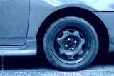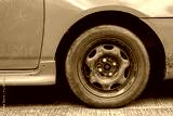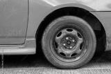 Old car wheels and old tires. It need to be replaced. This may cause an accident on the road.