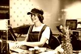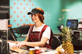 Young smiling female cashier in uniform happily using cashbox while working in modern supermarket
