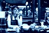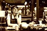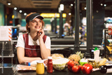 Young cheerful female cashier in uniform joyfully looking aside with products on cash line near while working in modern supermarket