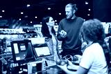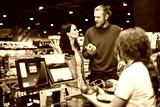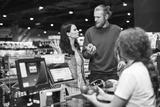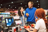 Young couple standing near cashier desk emotionally discussing something while buying products together in modern supermarket