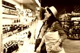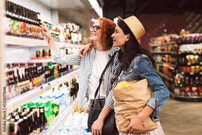 Pretty girls with paper grocery bag full of products joyfully choosing products in supermarket