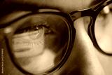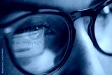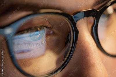vision, business and education concept - close up of woman eyes in glasses looking at computer screen