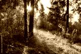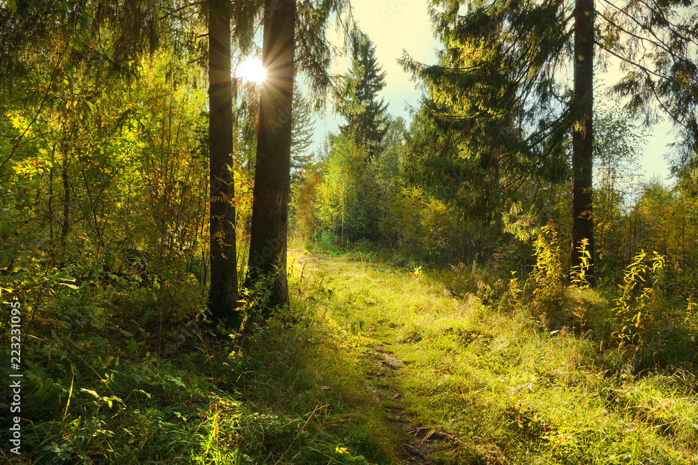 forest landscape. mixed wood two ate the sun through trees footpath in the forest.