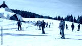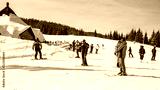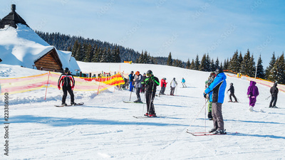 Winter holidays in the mountains. Mountain-skiing resort in the Carpathians.several skiers on a snowy road
