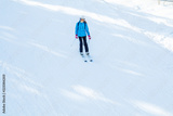 a woman in blue in a ski suit and mask goes down on a snow skiing track. View from above.