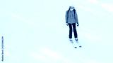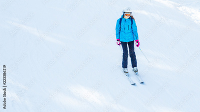 a woman in blue in a ski suit and mask goes down on a snow skiing track. View from above.