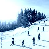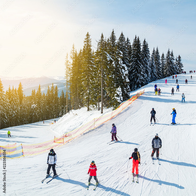 Winter holidays in the mountains. Mountain-skiing resort in the Carpathians.several skiers on a snowy road
