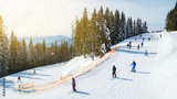 Winter holidays in the mountains. Mountain-skiing resort in the Carpathians.several skiers on a snowy road