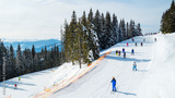 Winter holidays in the mountains. Mountain-skiing resort in the Carpathians.several skiers on a snowy road
