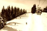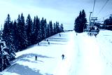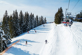 Winter holidays in the mountains. Mountain-skiing resort in the Carpathians.several skiers on a snowy road