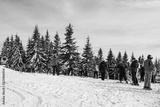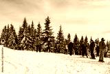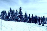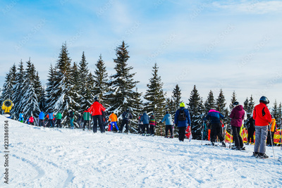 Winter holidays in the mountains. Mountain-skiing resort in the Carpathians.several skiers on a snowy road