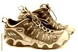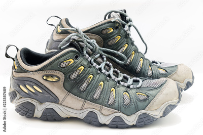 Close-up top view studio shot a pair of unbranded men hiking/trekking shoes or boots isolated on the white background