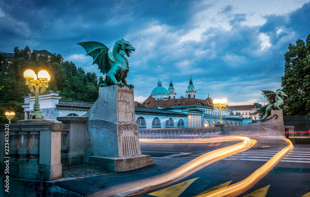 Dragon bridge (Zmajski most), symbol of Ljubljana, capital of Slovenia, Europe. Long exposure. Time lapse.