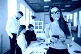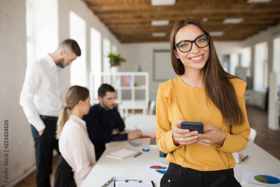 Young business woman in eyeglasses happily looking in camera while holding cellphone in hands in office with colleagues on background