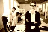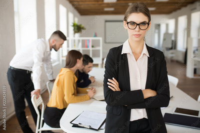 Young serious business woman in eyeglasses and shirt thoughtfully looking in camera while working in office with colleagues on background