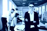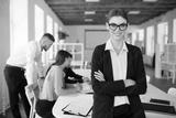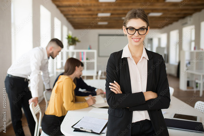 Young smiling business woman in eyeglasses and shirt happily looking in camera with folded hands while spending time in office with colleagues on background