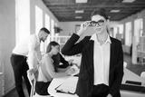 Young business woman in eyeglasses and shirt dreamily looking in camera while spending time in office with colleagues on background